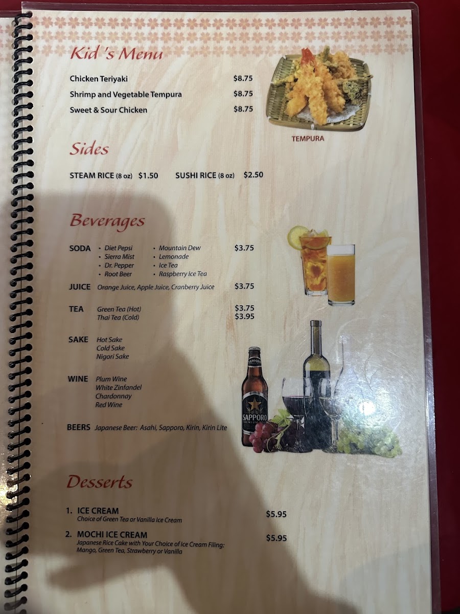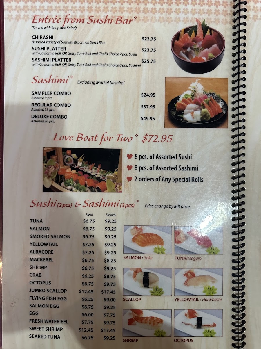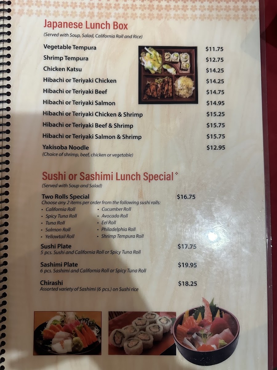 The menu is suitable for lunch and dinner service, offering a range of dishes that accommodate different tastes and appetites. The layout supports choosing anything from quick sushi rolls to more complex noodle soups and grilled entrees, making it versatile for both quick orders and relaxed meals.