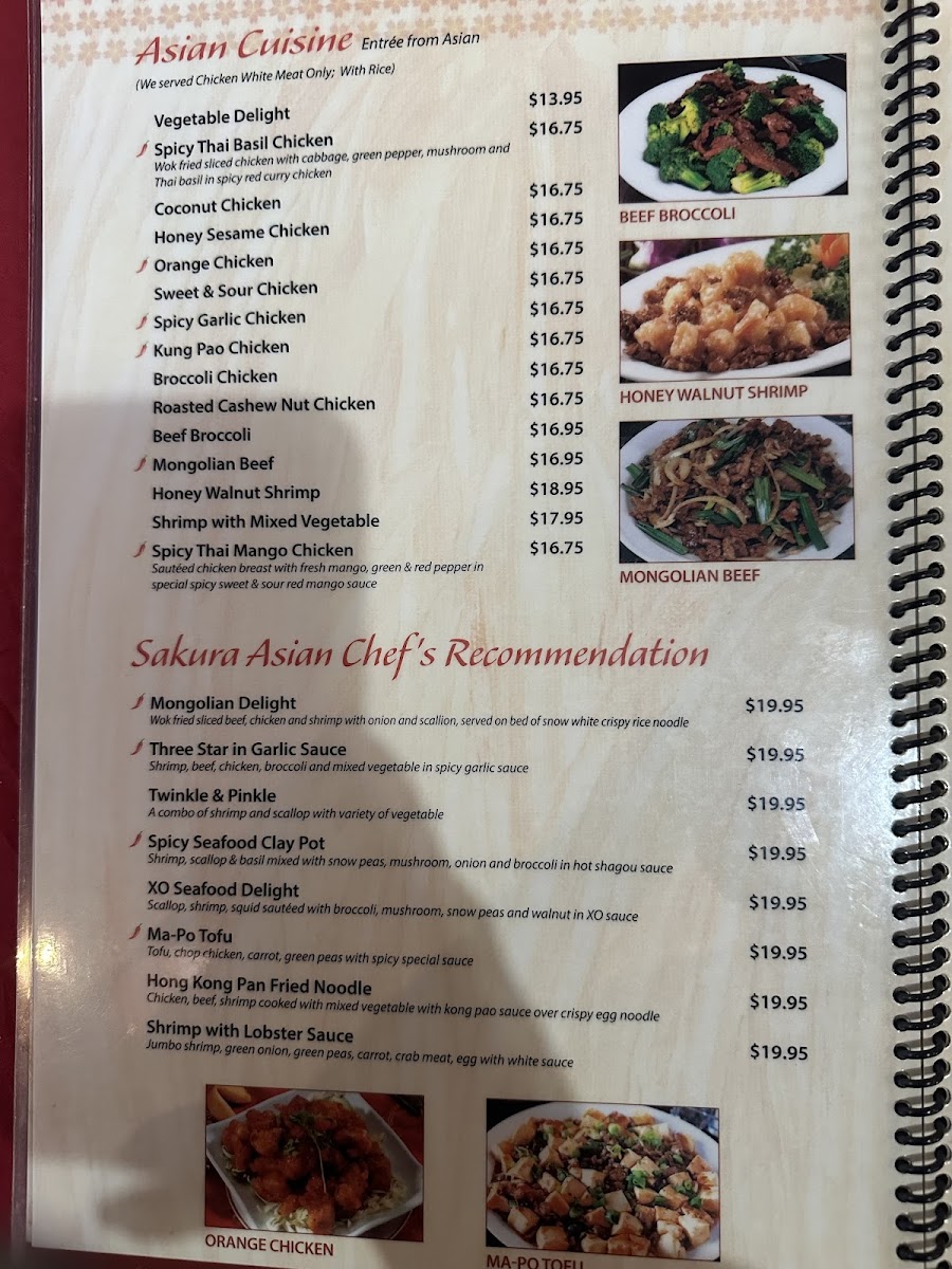 The menu at Sakura's Sushi and Grill offers a variety of Japanese and Asian-inspired dishes, including sushi rolls, soups, noodles, and grilled entrees. It is designed to accommodate both casual dining and quick lunches, featuring options suitable for light meals as well as more substantial dishes.
